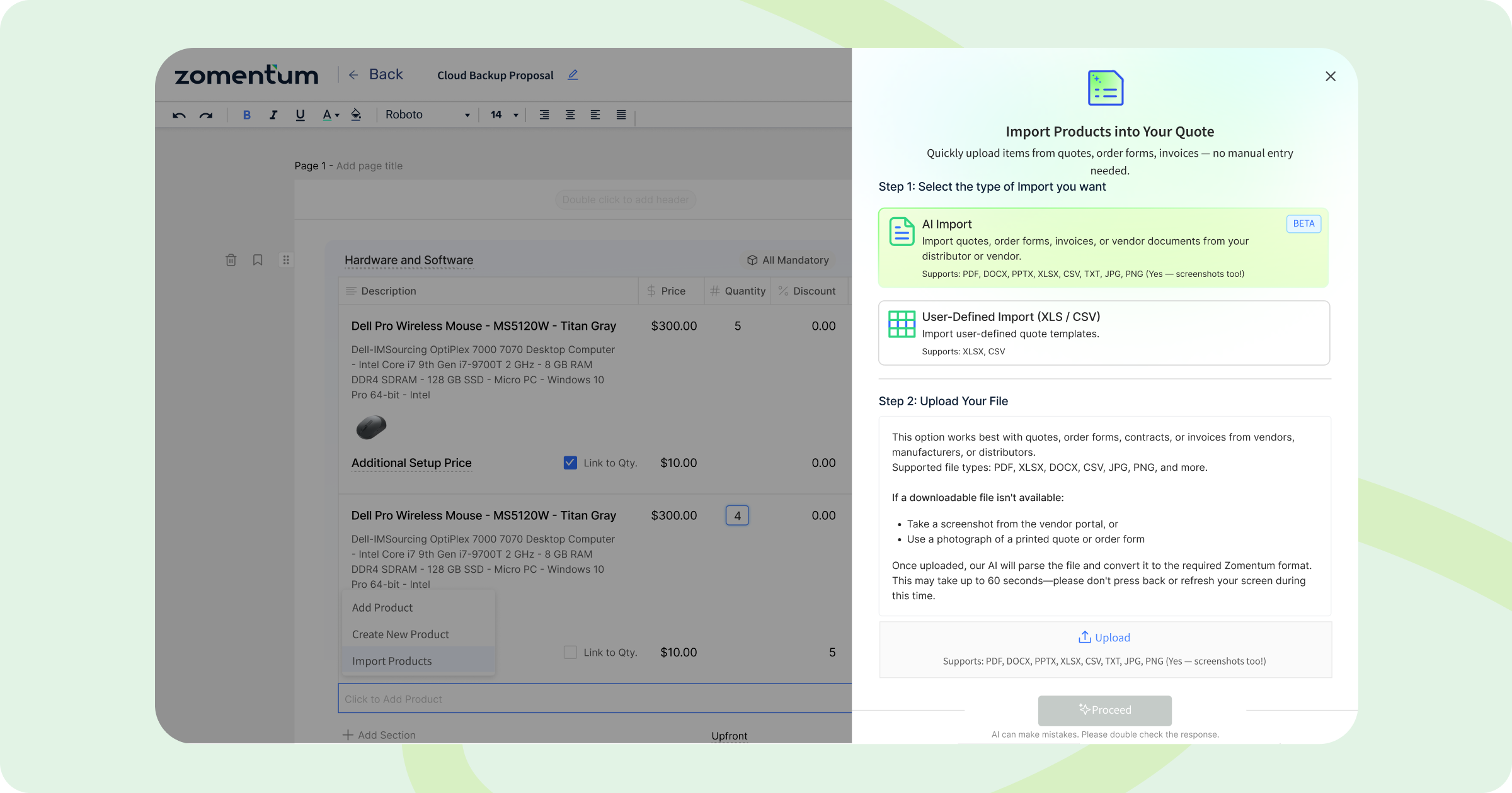 You can now import vendor or distributor quotes directly into Zomentum, no manual entry required. Upload files in multiple formats and let AI automatically extract products, SKUs, quantities, and pricing into clean line items inside your quote, even when vendor layouts vary. Supports: PDF, DOCX, PPTX, XLSX, CSV, TXT, JPG, PNG (yes — screenshots too!)