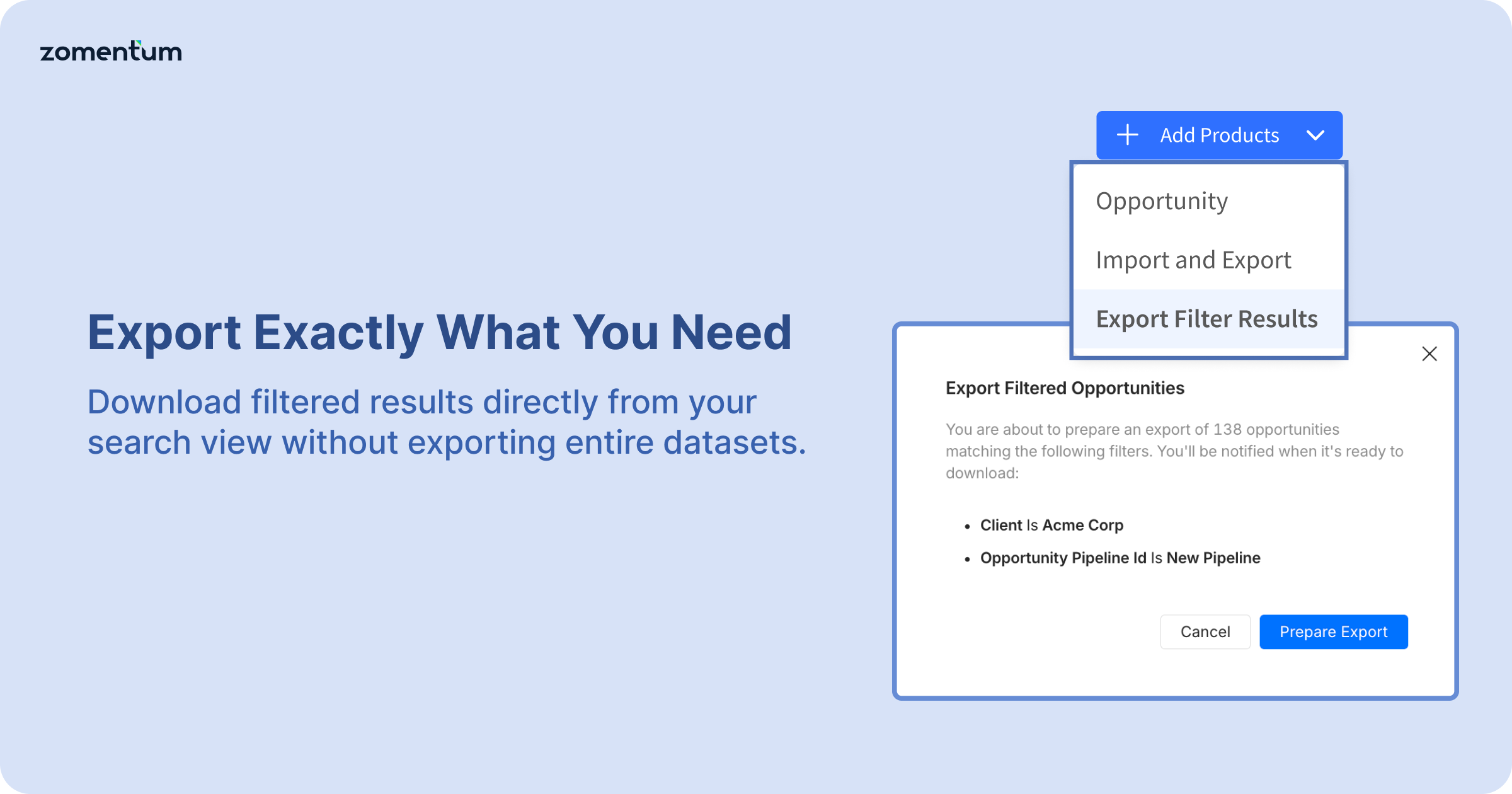 Users can now export filtered opportunity results directly from their search view, allowing more precise and efficient data downloads.