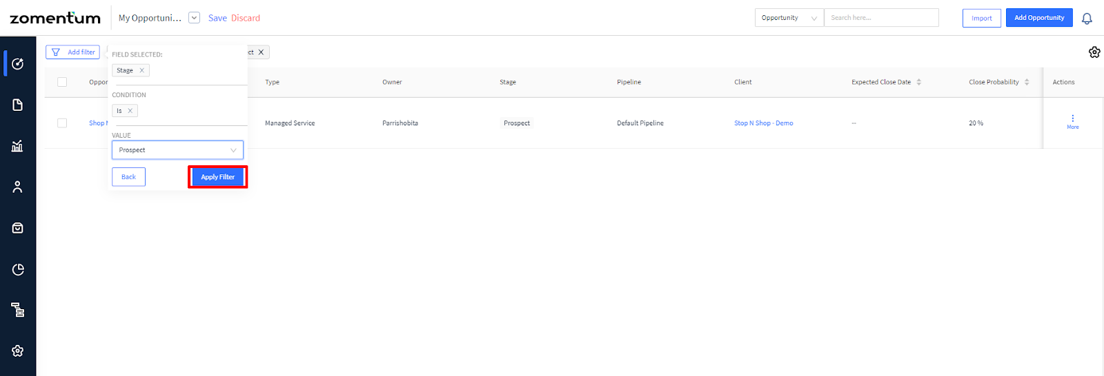 For example, to view all opportunities which are in the ‘Prospect’ stage, add the following condition and click on “Apply Filter”.